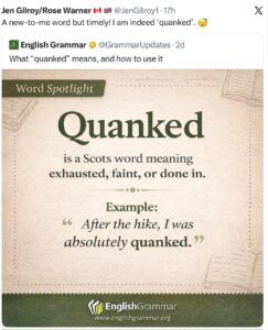 This week on X (formerly Twitter) I spotted and shared ‘quanked’, a Scottish word meaning ‘exhausted, faint, or done in.’